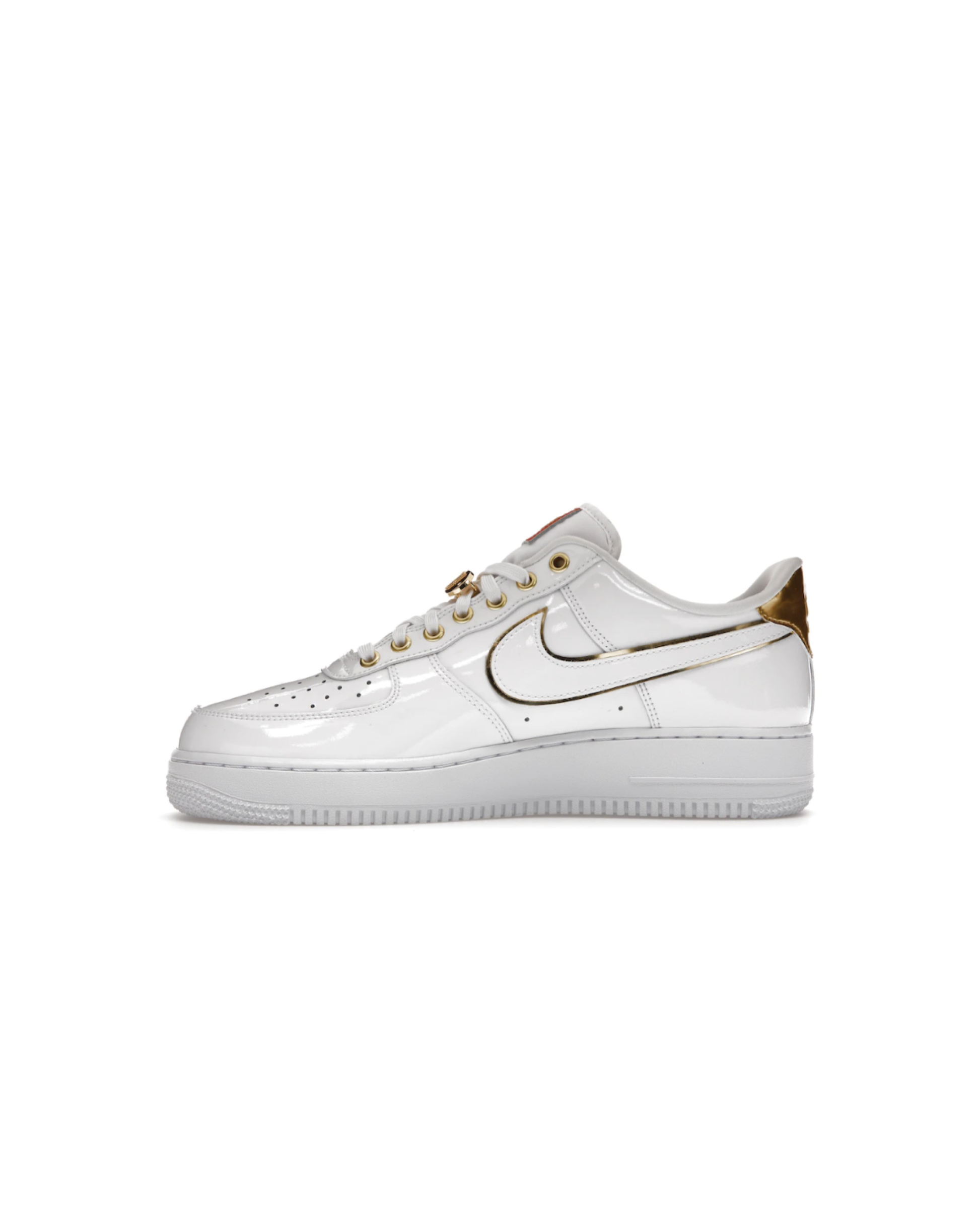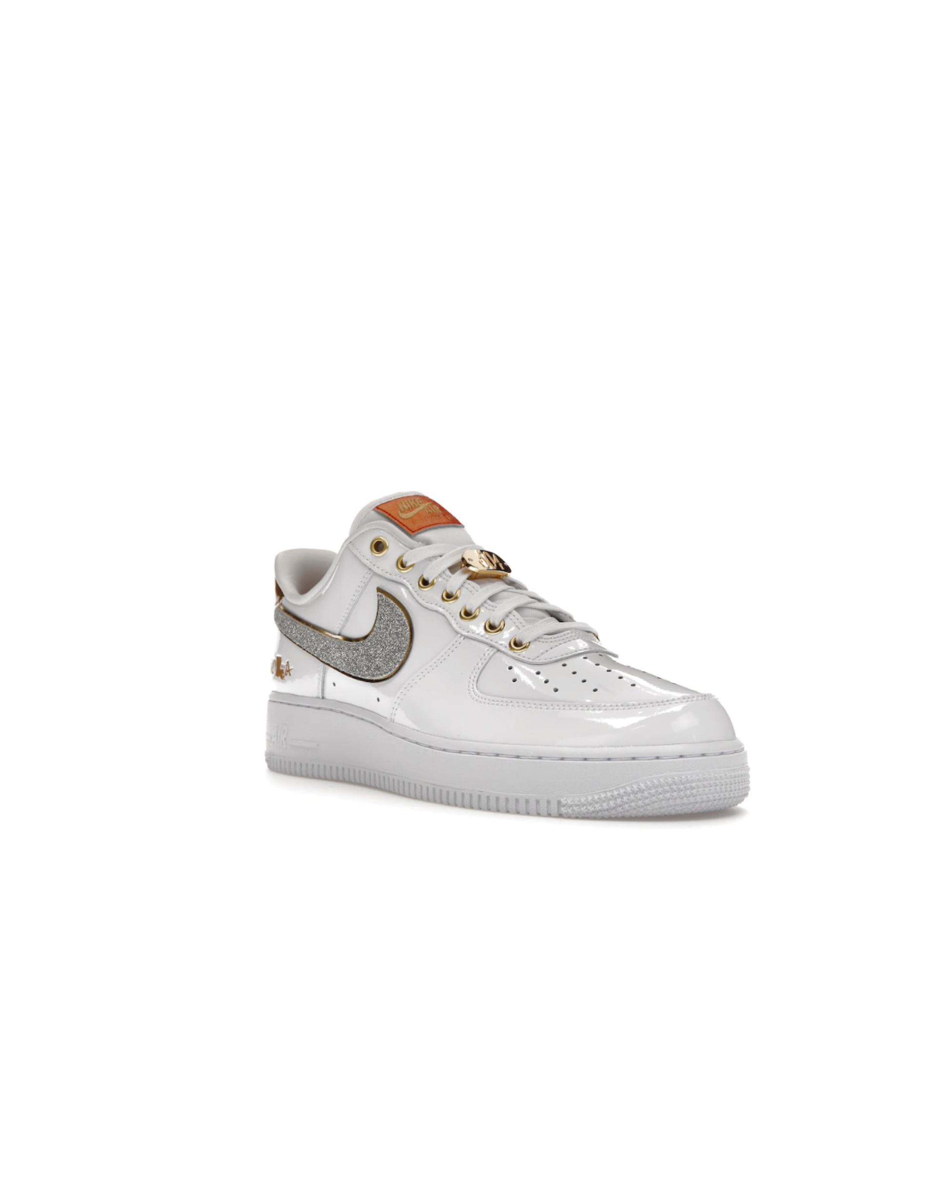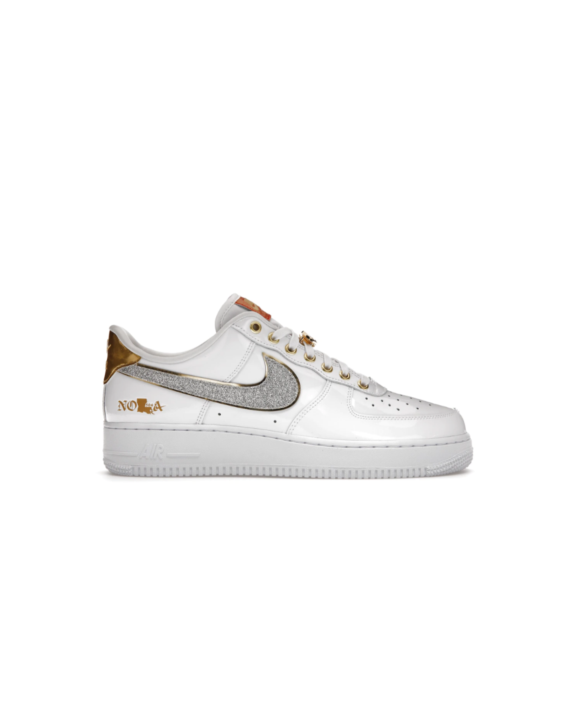 The Nike Air Force 1 Low NOLA sneaker is encased by an upper made of smooth white and patent leather. The shoe features tonal detailing on the tongue, laces, inner liner, and entire sole unit. It also has metallic gold on the metal eyelets, heel tabs, tongue branding, special "504" lace looks, and NOLA insignia on the lateral heel. Sparkling silver Nike Swooshes with gold outlining and red-and-gold gradient insole finish off the look.
