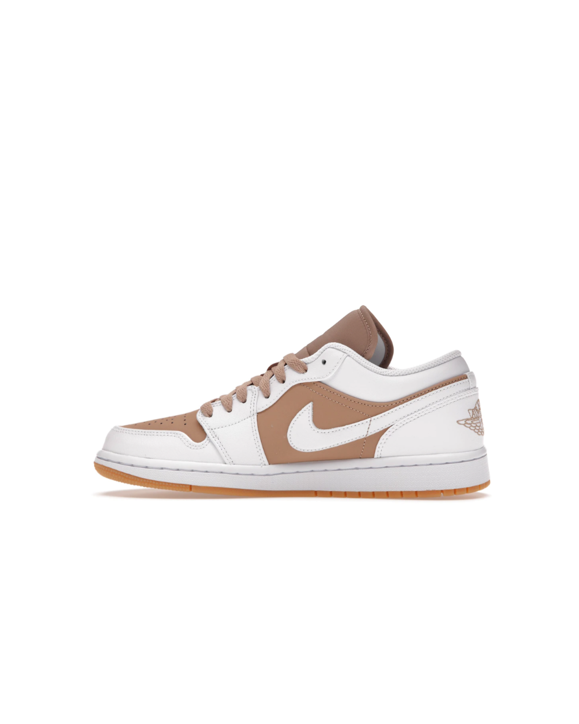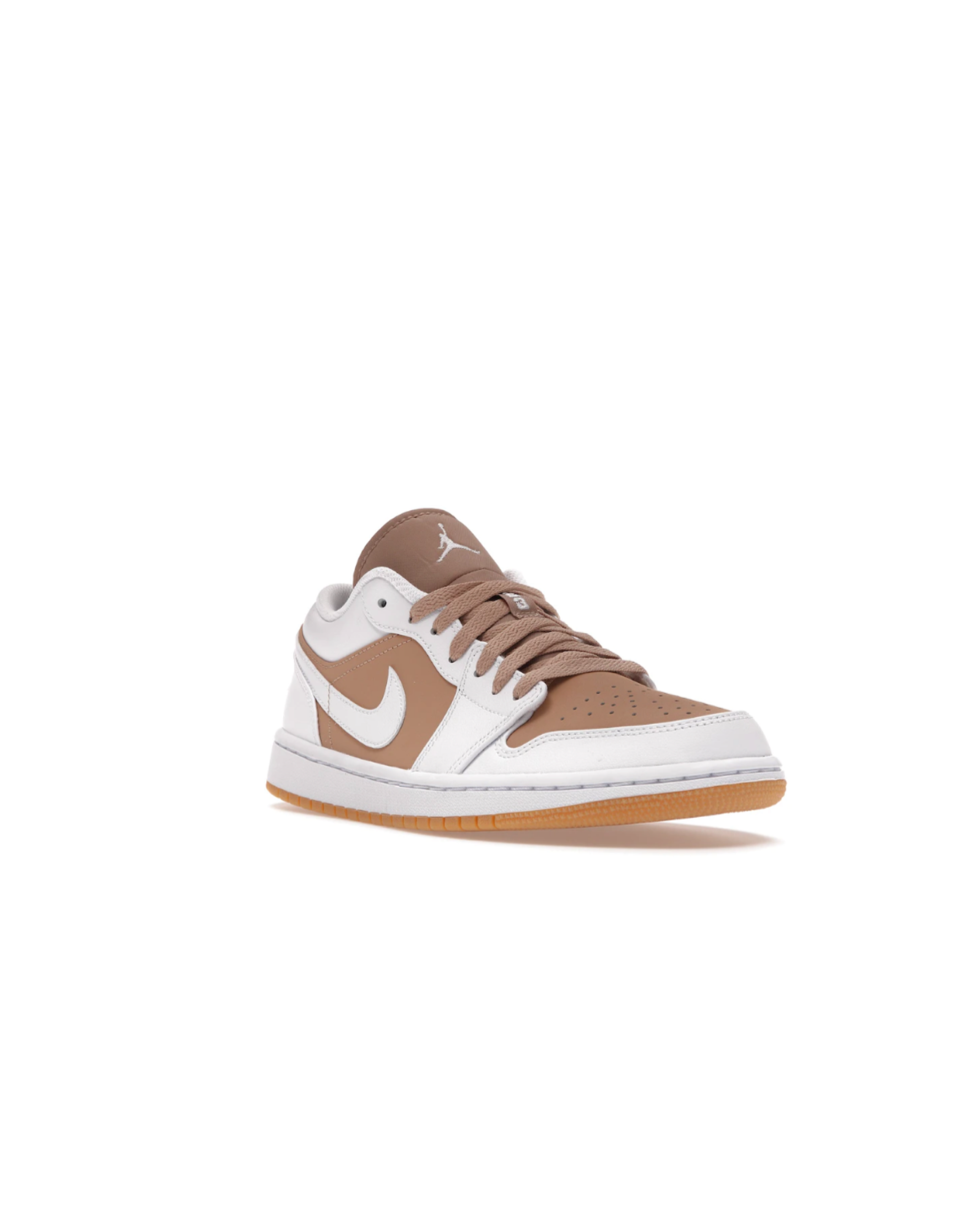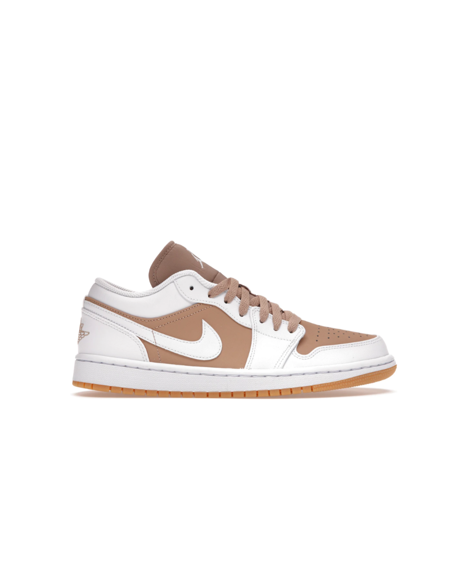 The shoe’s upper, heel counter, and pull tab are all constructed with white leather. The perforated toe box of Air Jordan 1 Low Gum White is made of perforated hemp leather. The elongated hemp tongue completes the retro design of the shoe. It all rests on a white midsole and hemp outsole, which are made of rubber.
