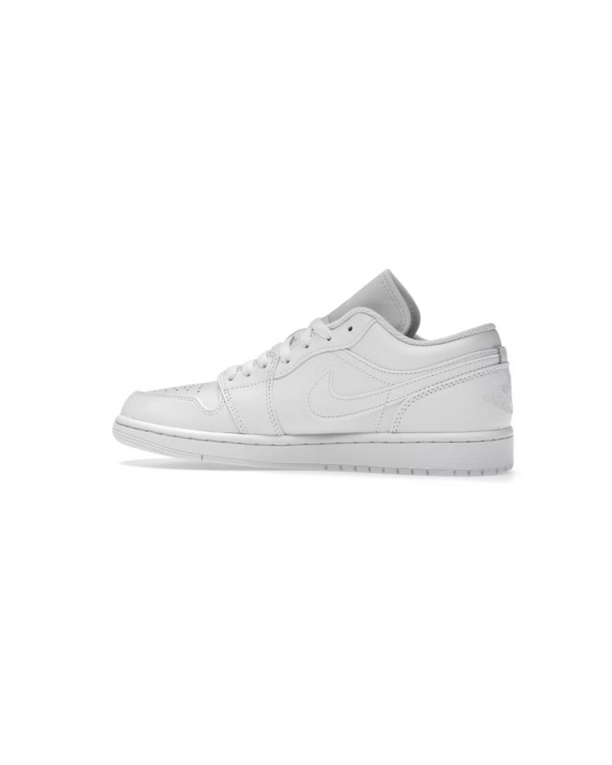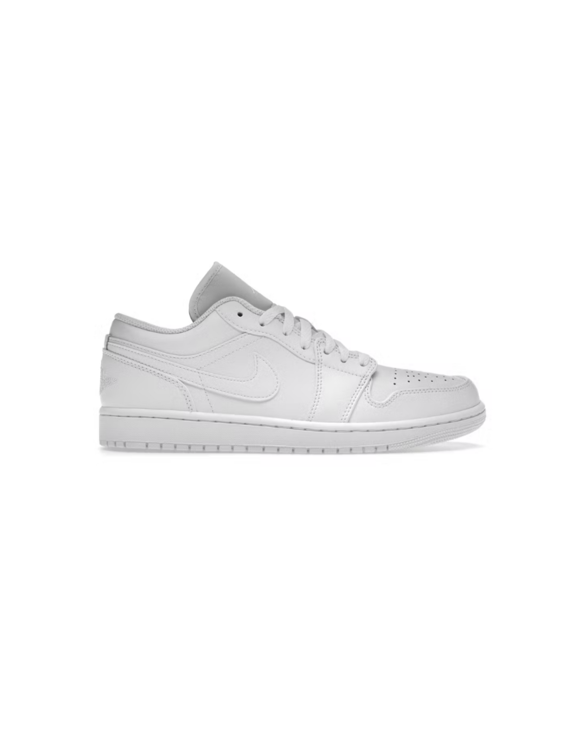 The smooth white leather upper of this Low Air Jordan 1 has perforations in the toe box, white leather overlays, and a white leather Swoosh. This sneaker also features a white rubber cupsole and an Air-sole unit in the heel. A white debossed Jumpman appears on the white padded tongue, a black Jumpman boasts on the white insole, and an embroidered white Wings logo is displayed on the white heel.