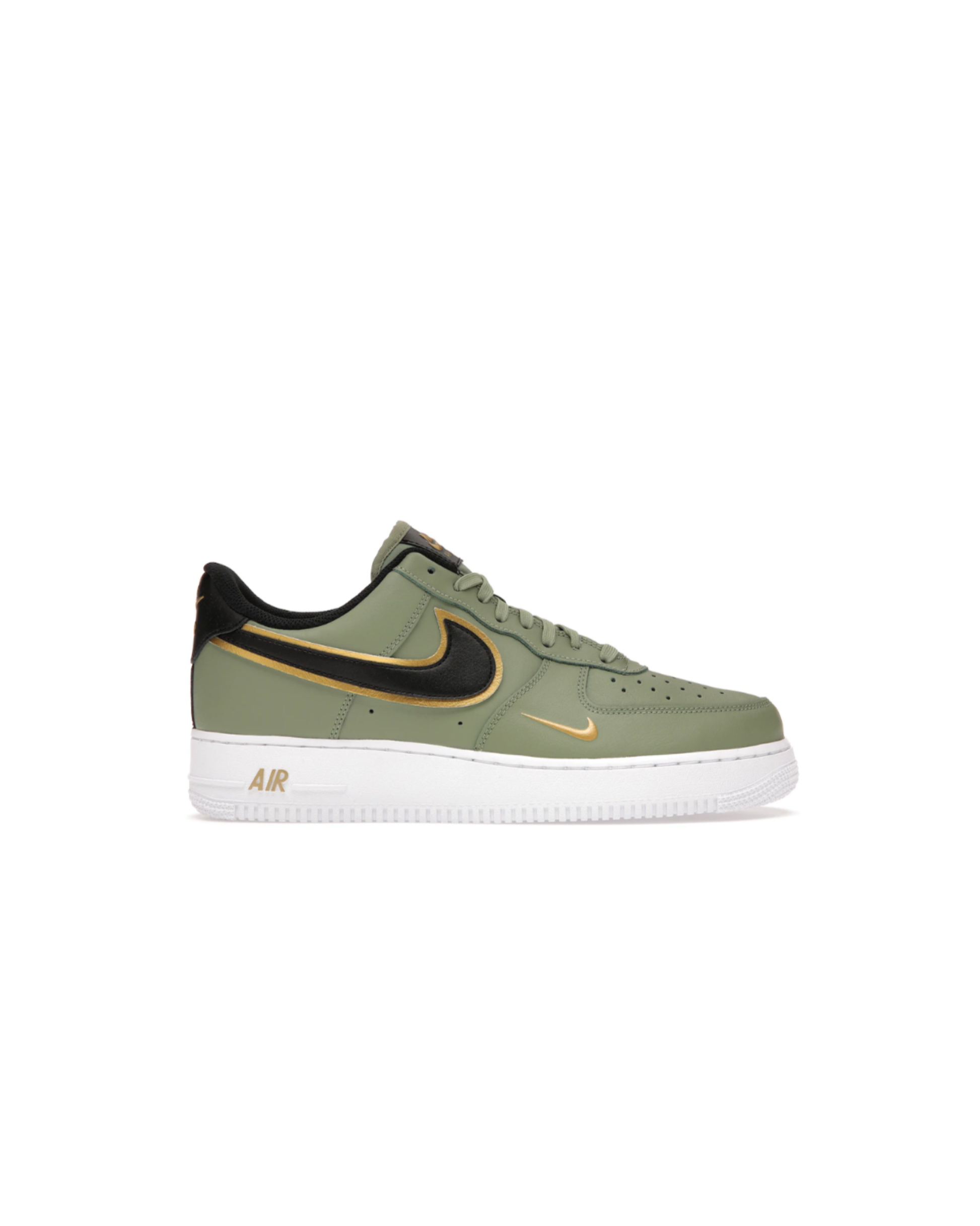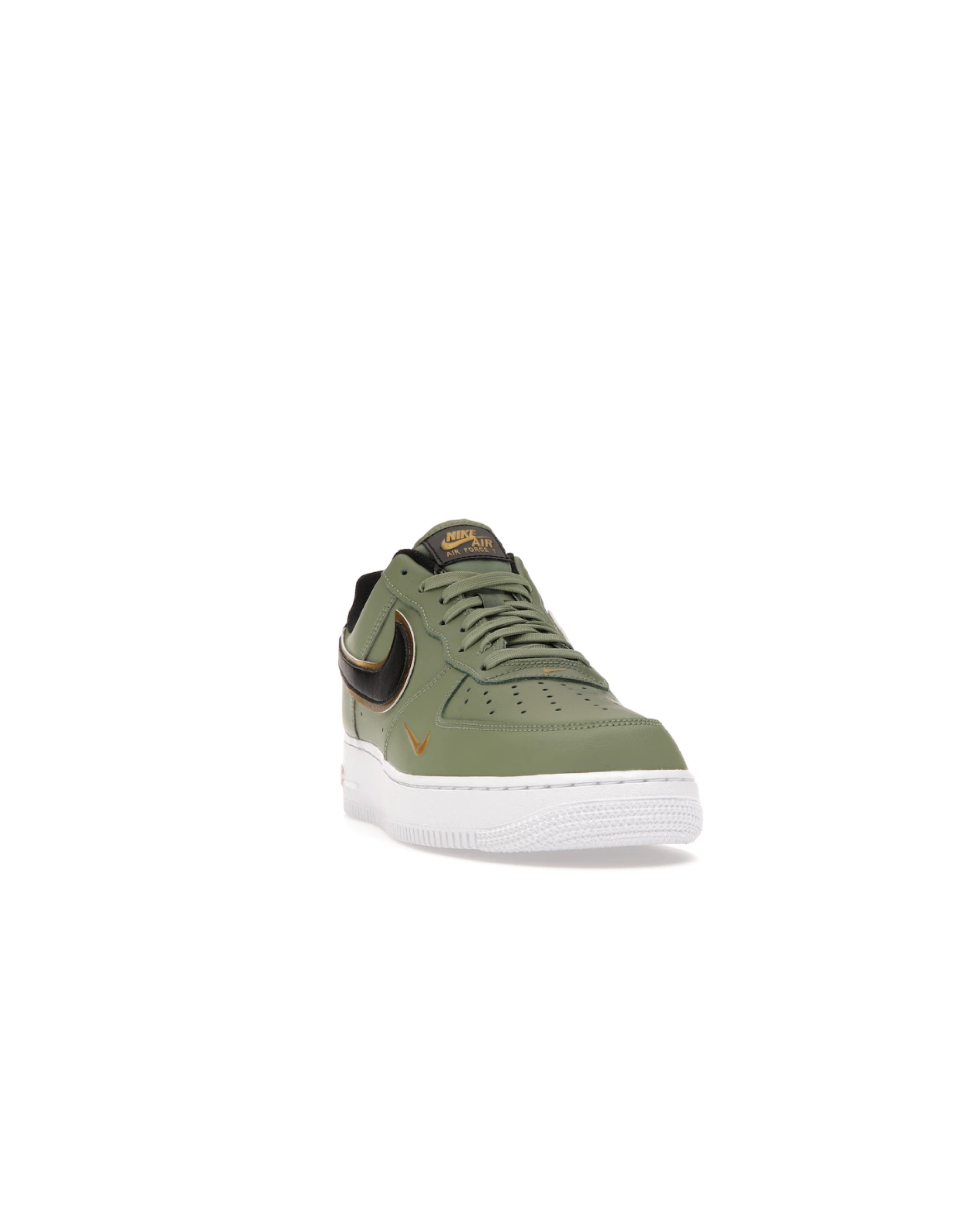 The Nike Air Force 1 Low '07 LV8 Double Swoosh Olive Gold Black is toned in a mixture of four main colors: black, white, Oil Green, and metallic gold.