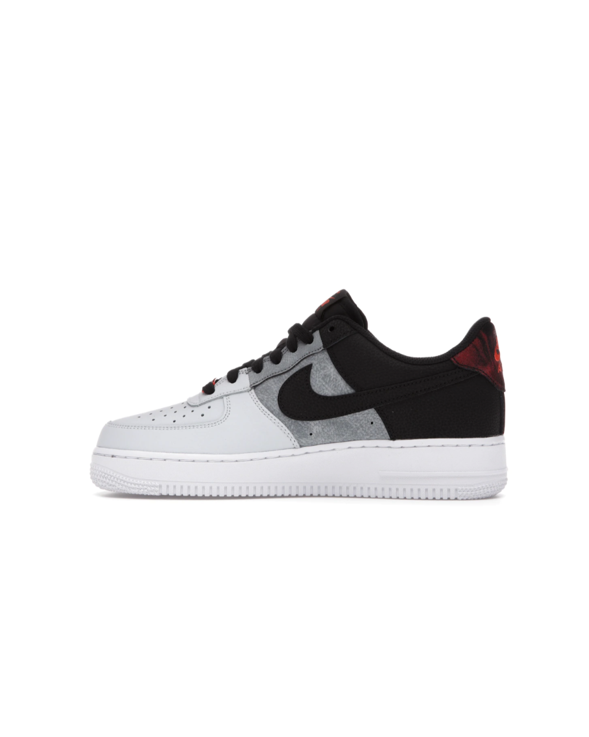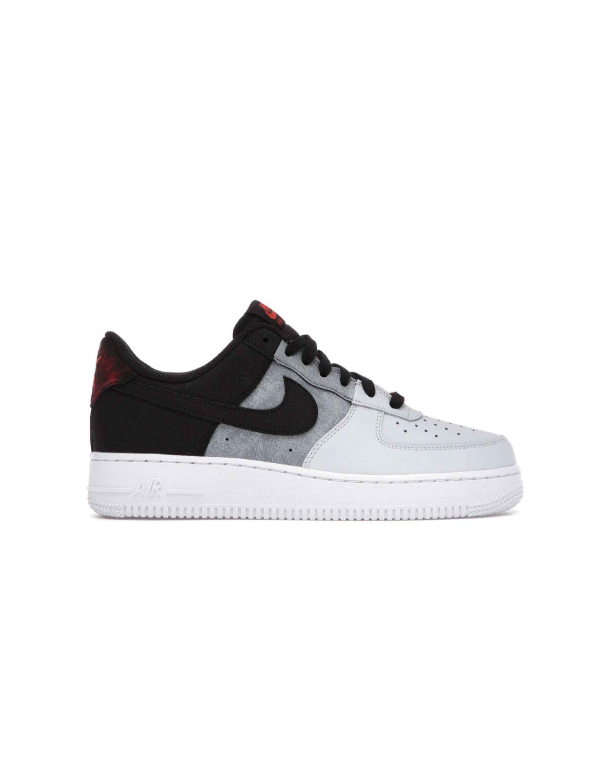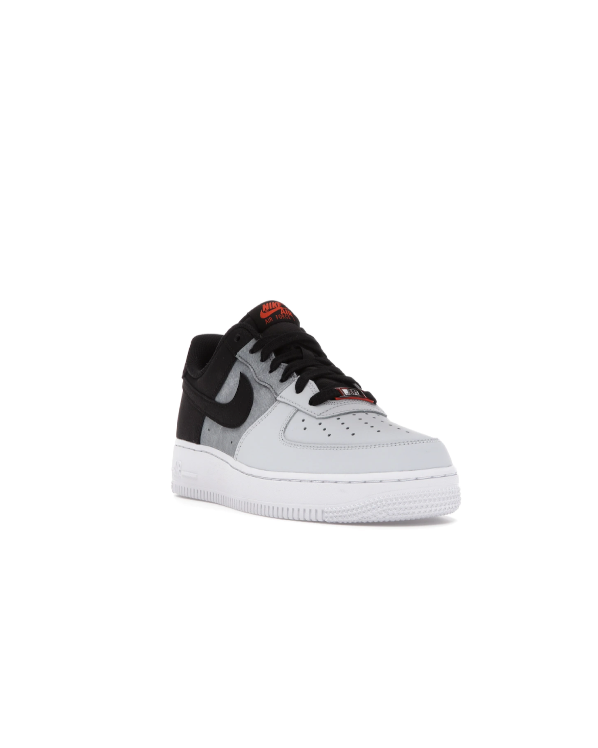 The sneaker's vamp comes in a perforated smoke grey color scheme, while its mid panel features pure platinum, and the heel area and laces come in a black hue. It has an encapsulated Air unit in the midsole, which provides lightweight cushioning and impact absorption. The padded collar and tongue add extra support and cushioning around the ankle, enhancing overall comfort. These sneakers feature a lace-up closure system, allowing for a secure and adjustable fit. Additionally, the sneaker has its Swooshes draped in black on its medial and lateral panels, while its laces feature a metallic anglet with an AF1 text embedded on it. Further branding details include a Nike Air text on the heel in fiery red and an orange Nike text on the padded tongue. Finally, its rubber pivot outsole offers traction.