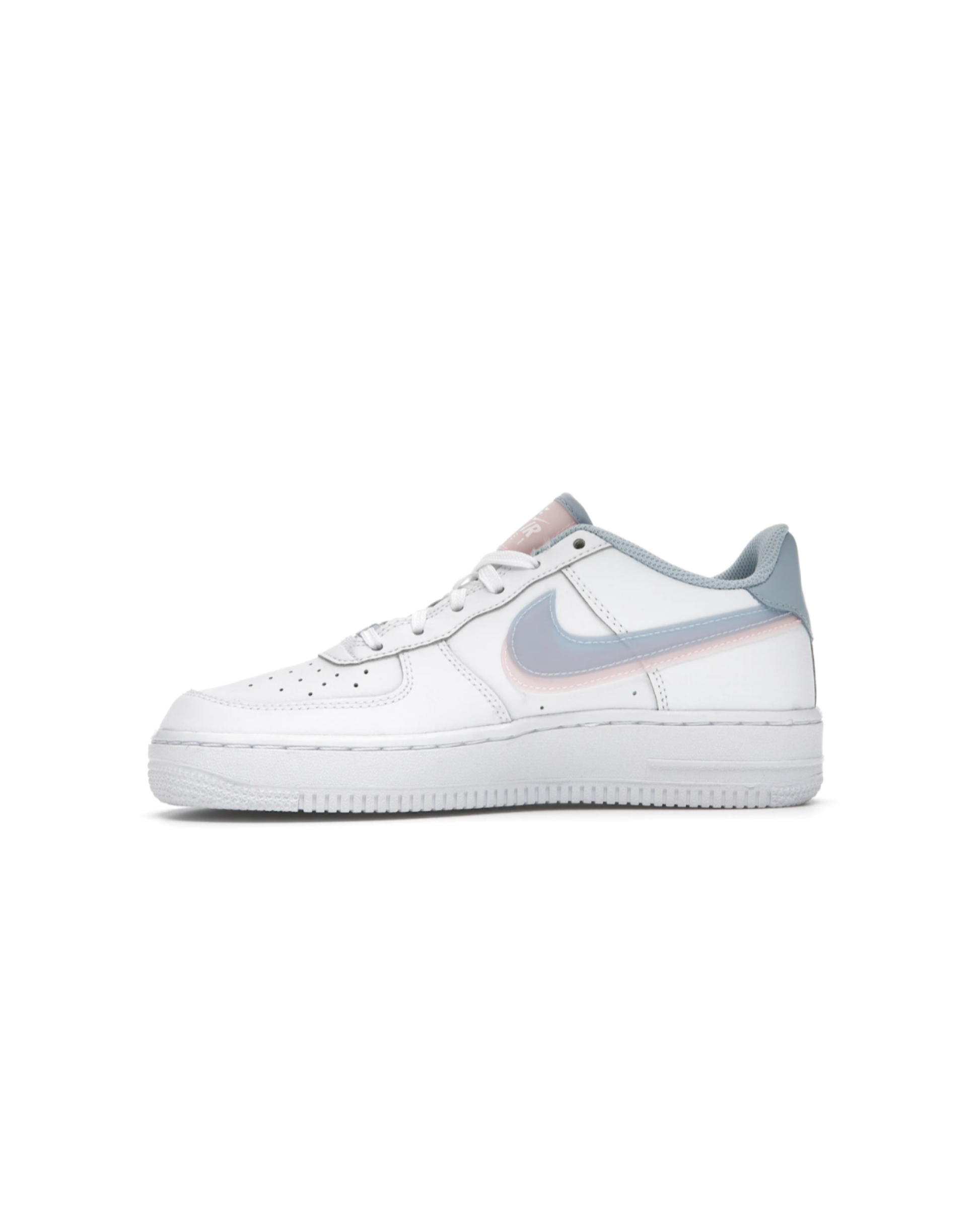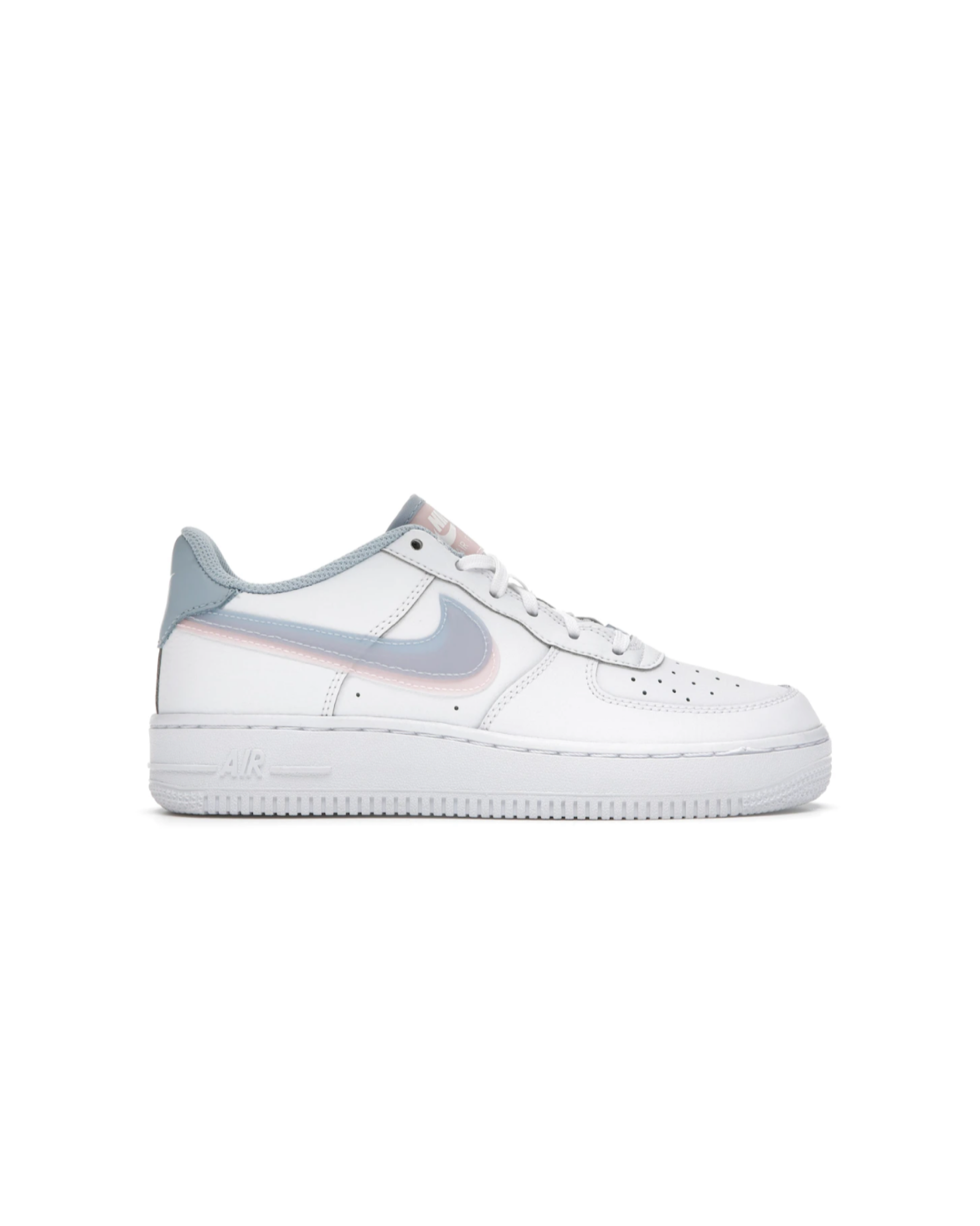 The Nike Air Force 1 in Light Armory Blue with a Low LV8 Double Swoosh design has a white leather upper that includes small holes on the front and sides. The shoe stands out with its translucent Swooshes in Arctic Punch and Light Armory Blue, which overlap each other. These colors are also present on the tongues and lace dubraes. The shoe is finished with a completely white rubber sole typical of the Air Force 1 style.
