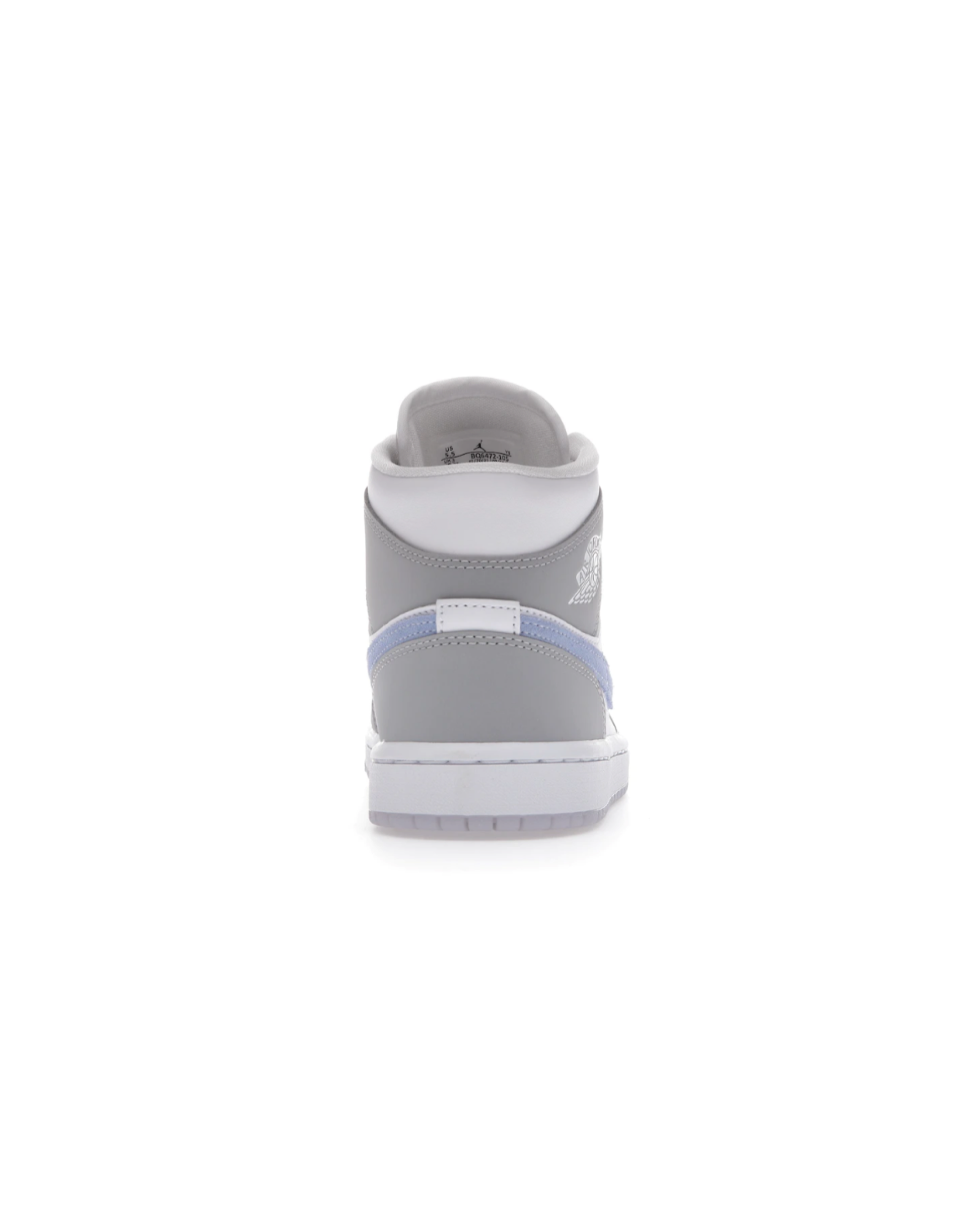 The Jordan 1 Mid Wolf Grey Aluminum (W) features a white leather upper with Wolf Grey Durabuck overlays and an Aluminum Swoosh. From there, a Jumpman woven tongue label and icy translucent sole completes the design. The Jordan 1 Mid Wolf Grey Aluminum released in July of 2021