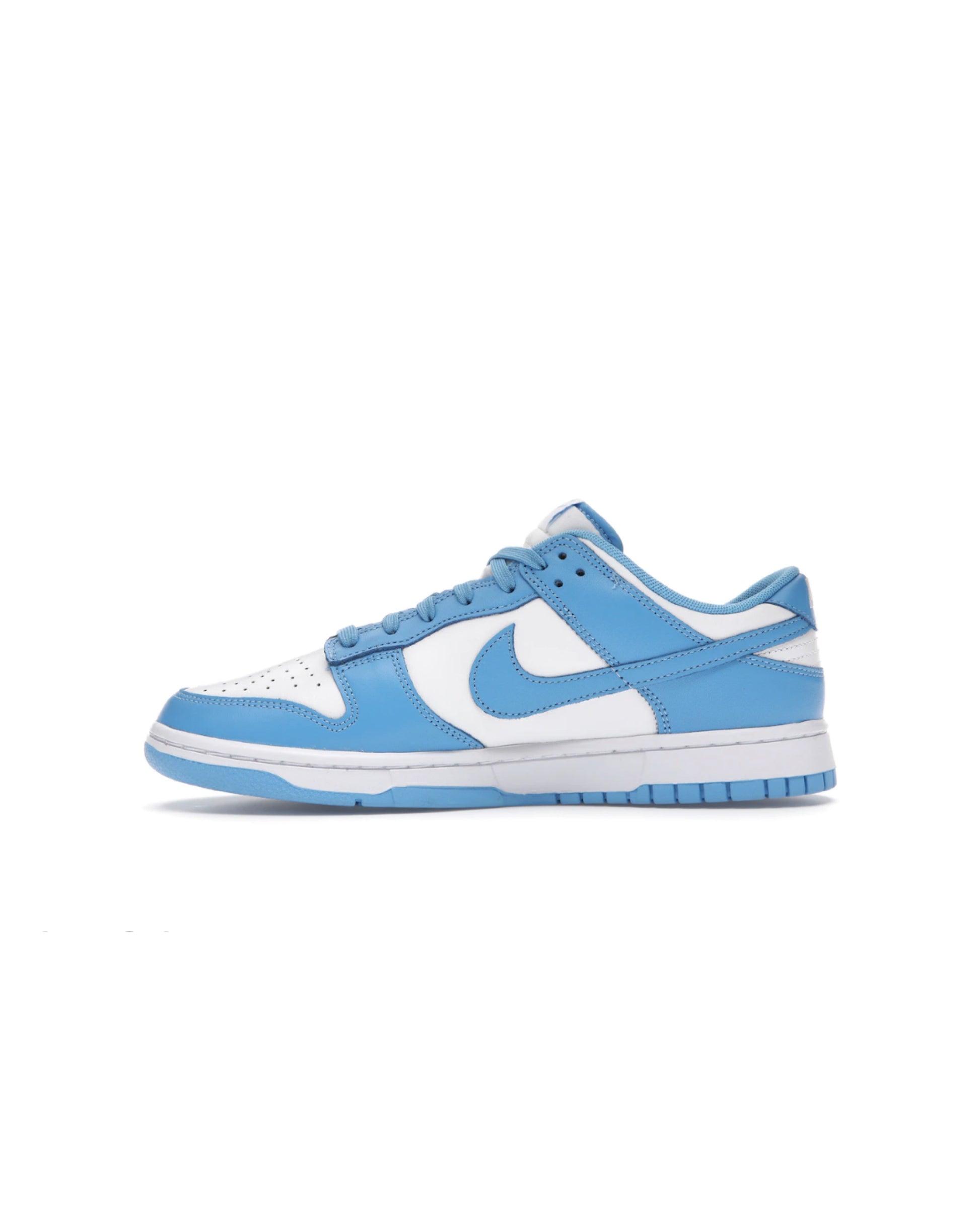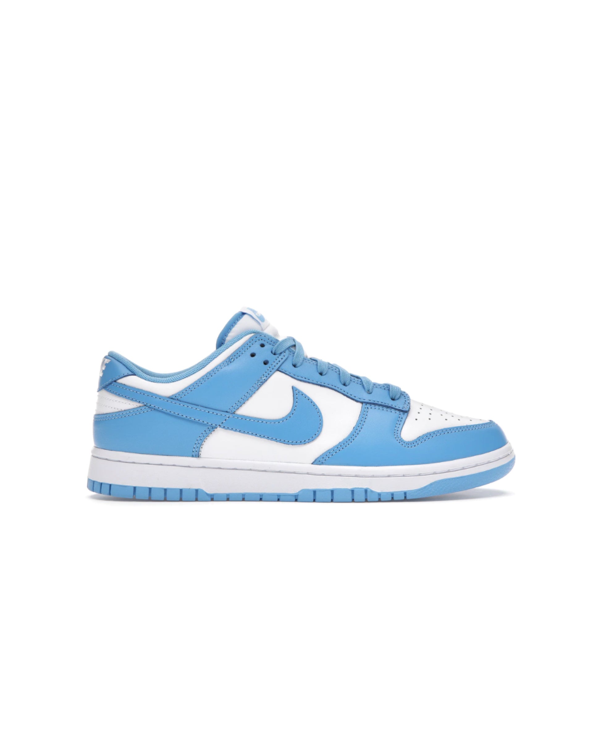 Nodding to the University of North Carolina Tarheels, the Nike Dunk Low UNC is constructed of a white leather upper with University Blue overlays and Swooshes. From there, a white and University woven Nike tongue label completes the design.