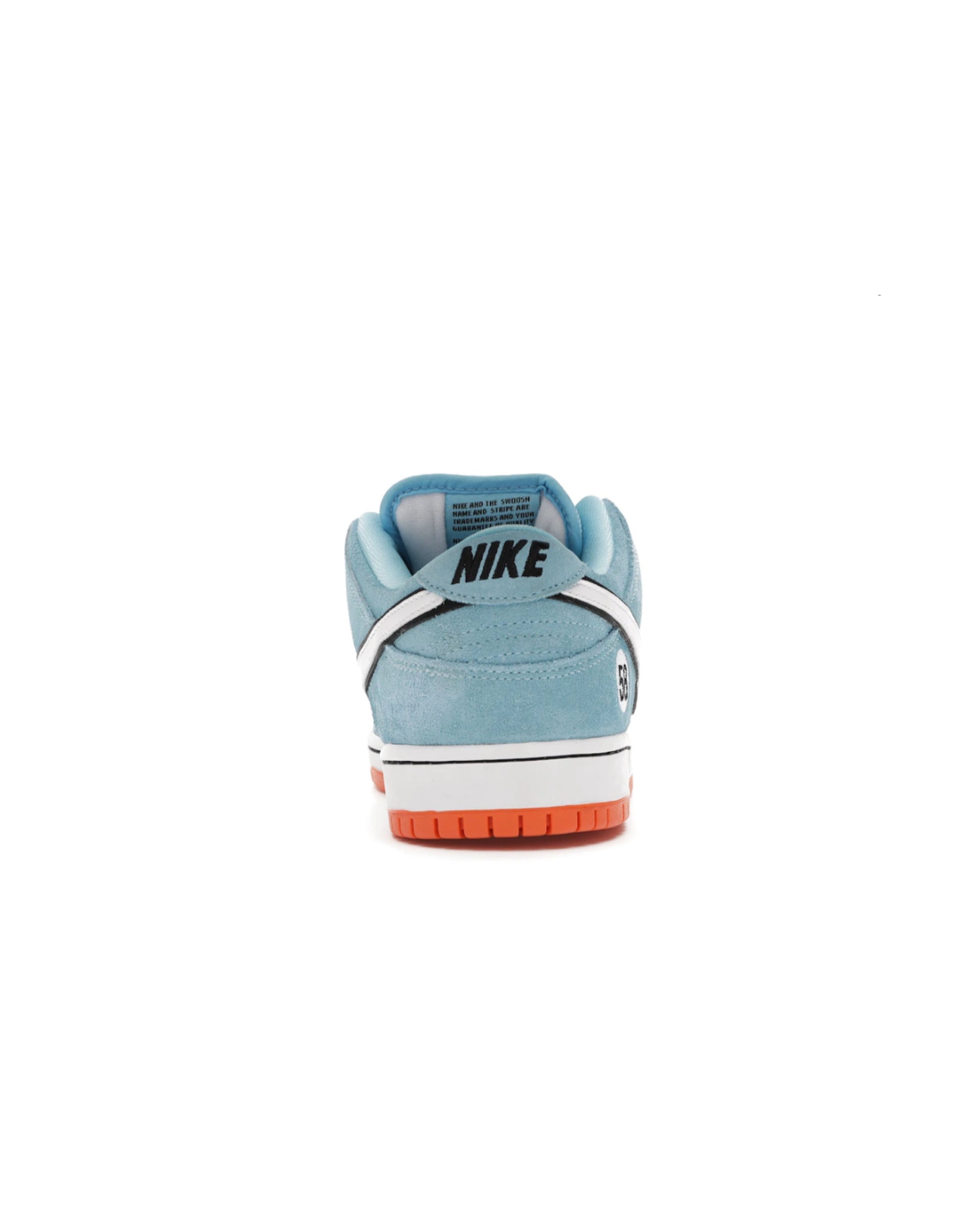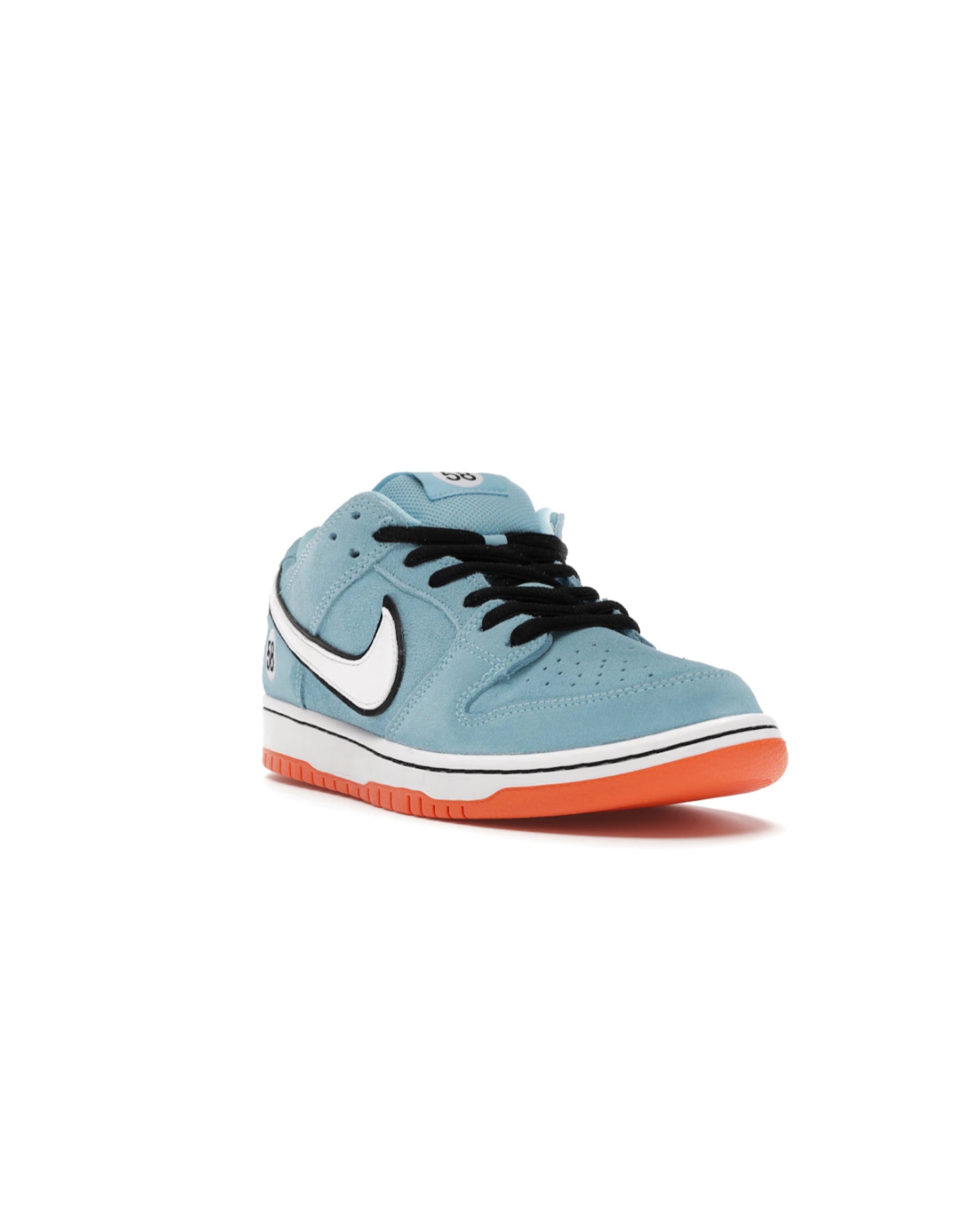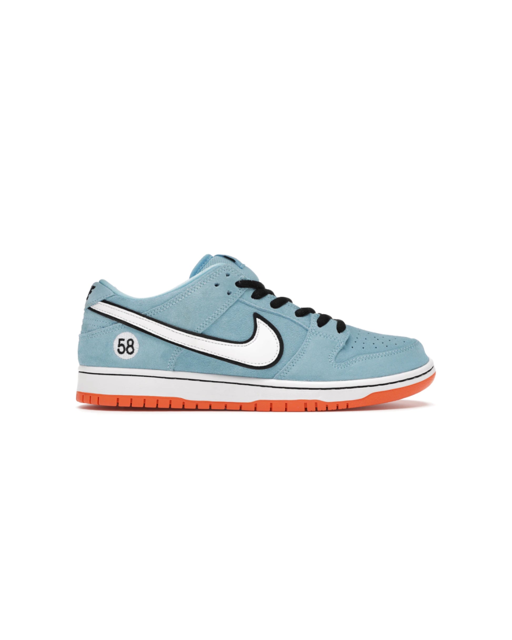 This light blue Nike SB Dunk Low Club 58 Gulf adds to the Dunk SB range of race car-inspired sneakers. The Nike SB Dunk Low Club 58 Gulf features a Blue Chill suede upper, with black laces and a white leather Swoosh contrasting the silhouette. A patch with the number 58 is embroidered near the heel, and the same digits are repeated on the woven tag affixed to the stuffed mesh tongue. The design is finished with a two-tone sole: white with an orange outsole.