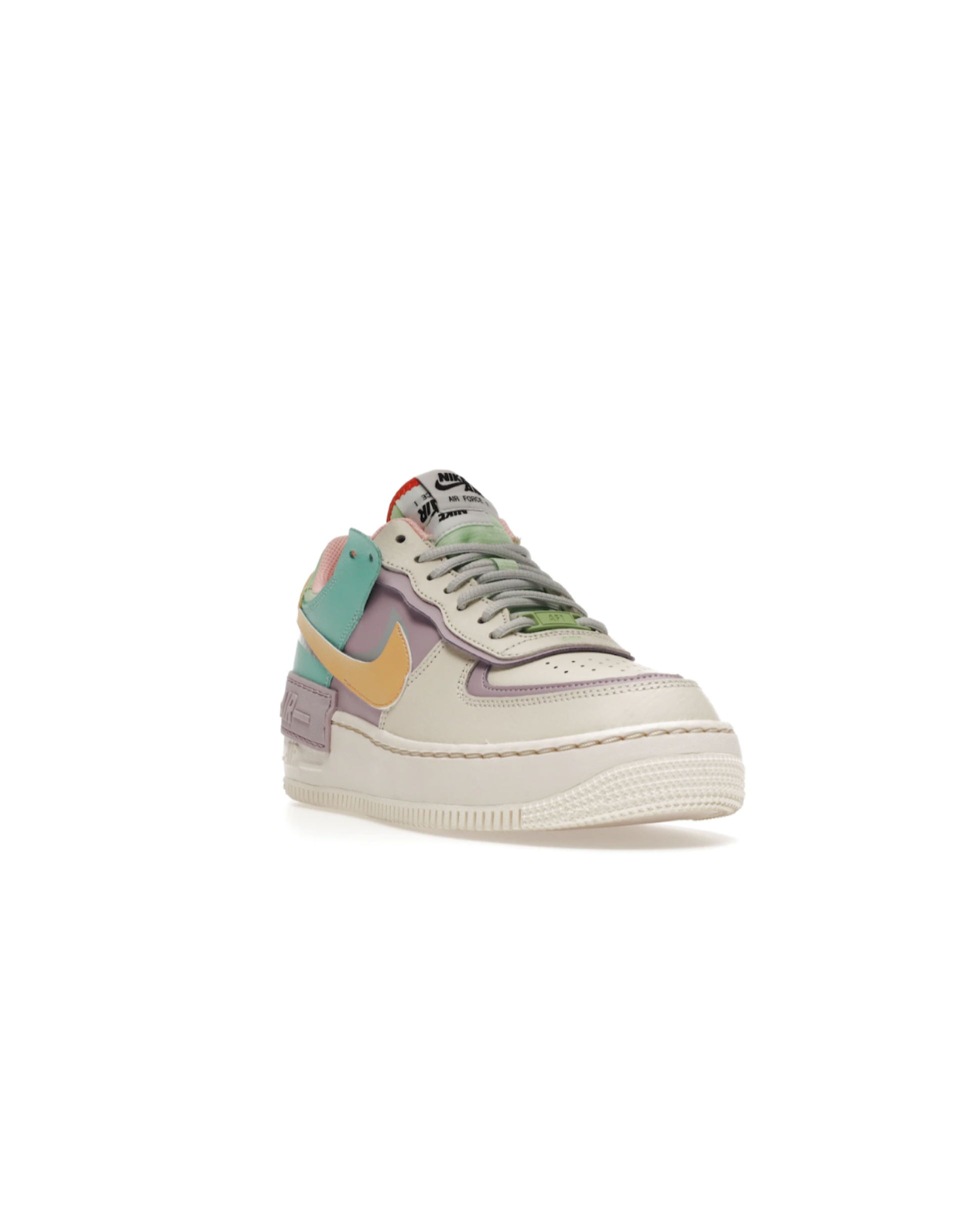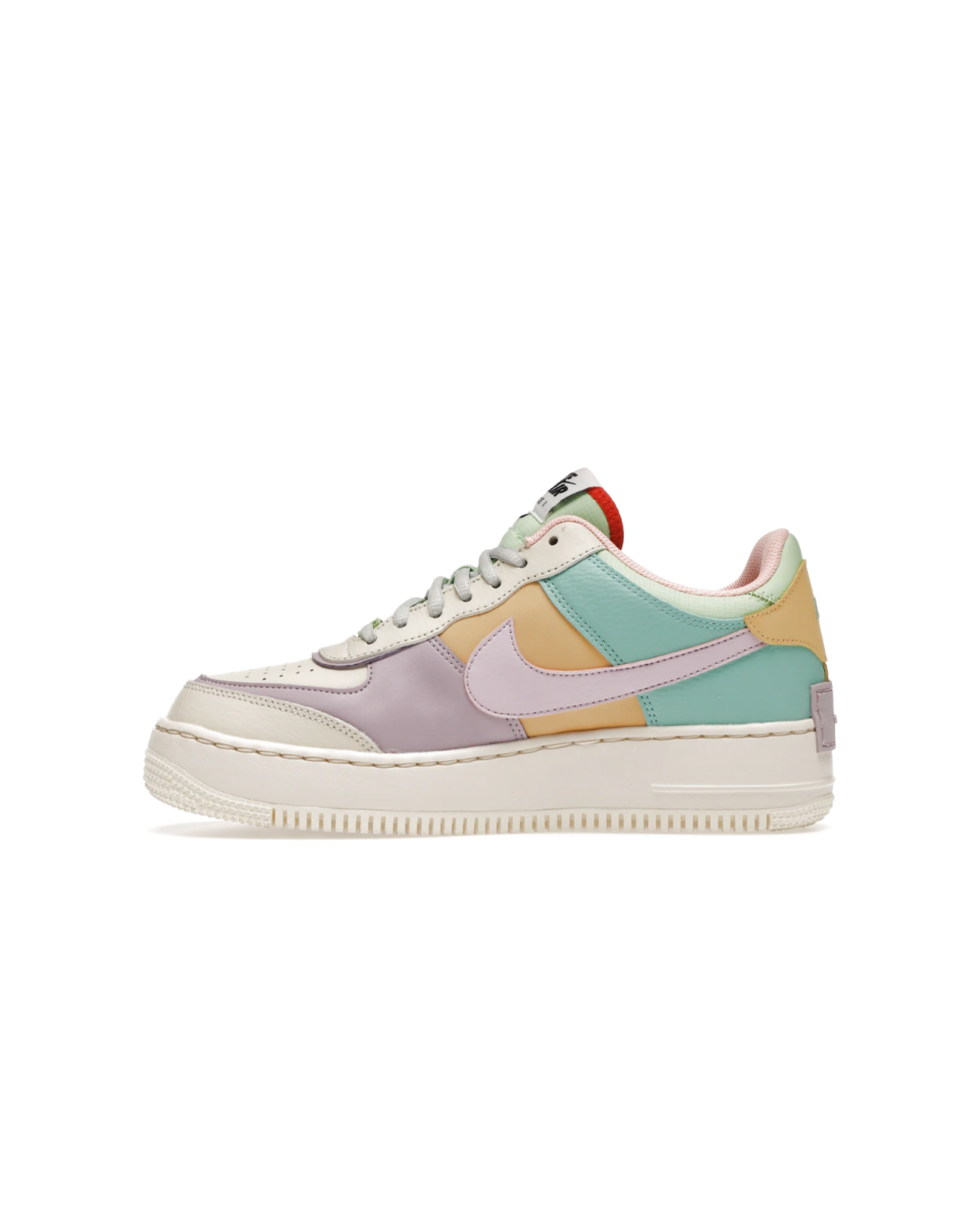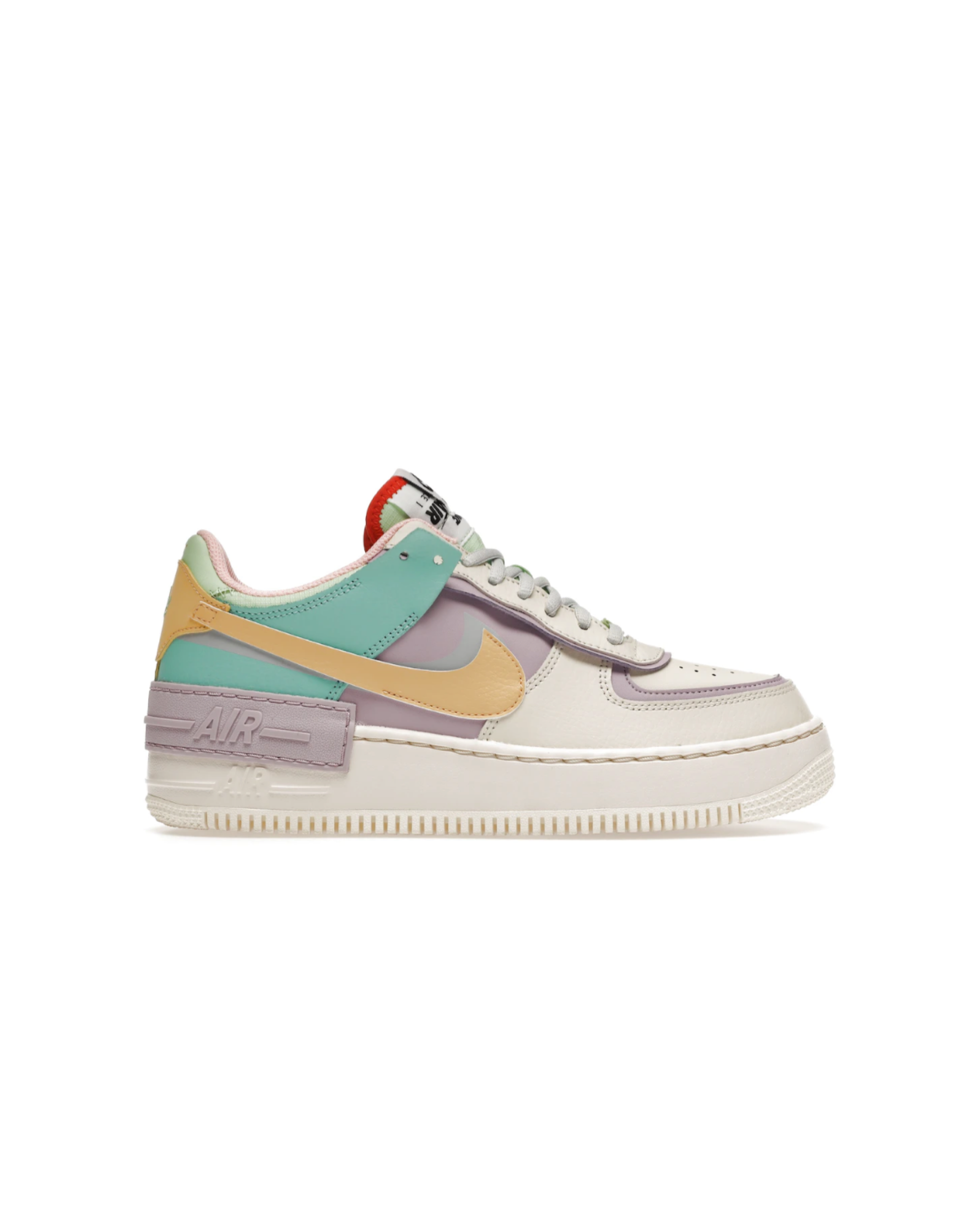 The women's Nike Air Force 1 Shadow Pale Ivory (W) features a multicolor premium leather upper with visible stitching and raised panels. From there, a raised midsole and gold patches at the back of the ankle complete the design.