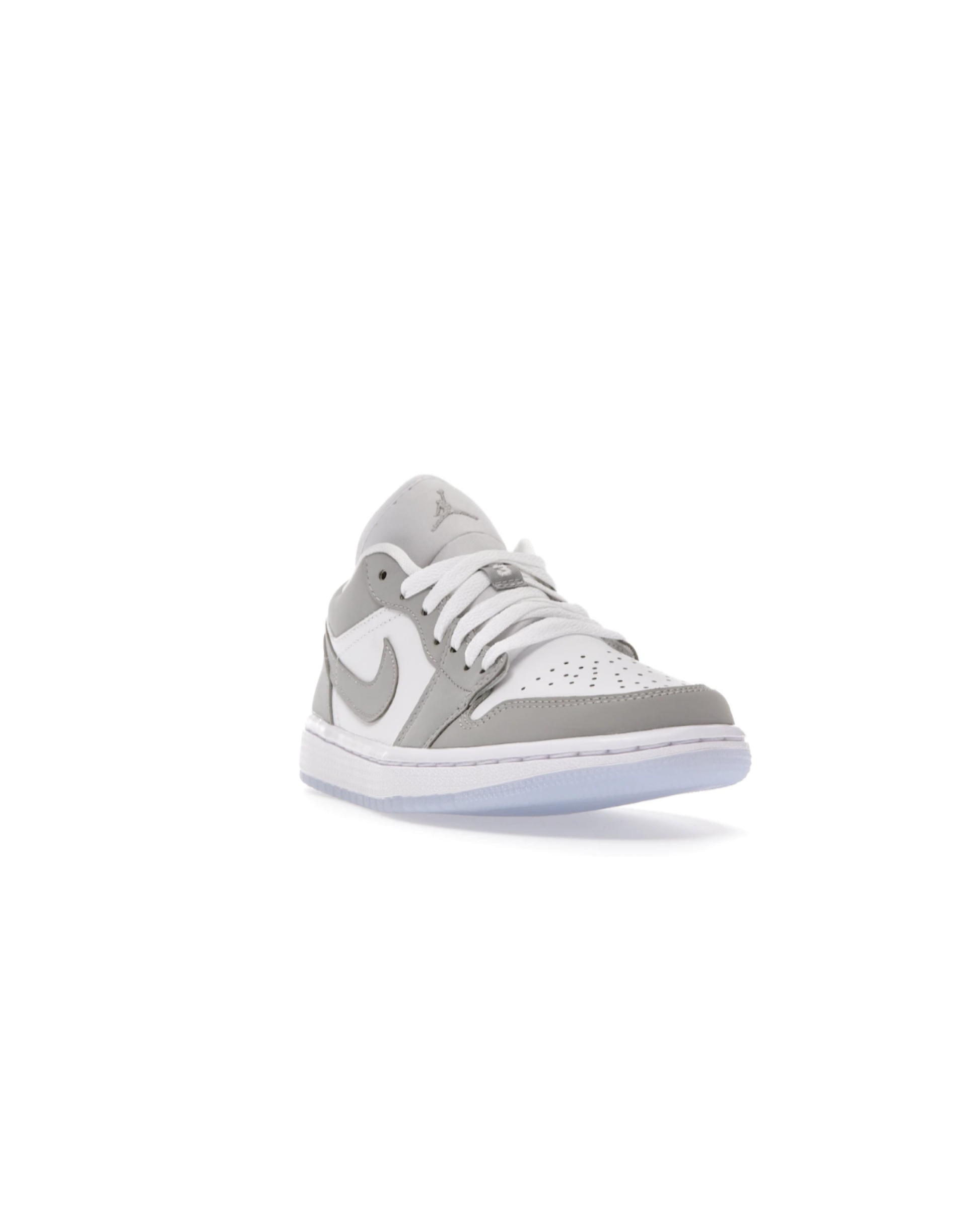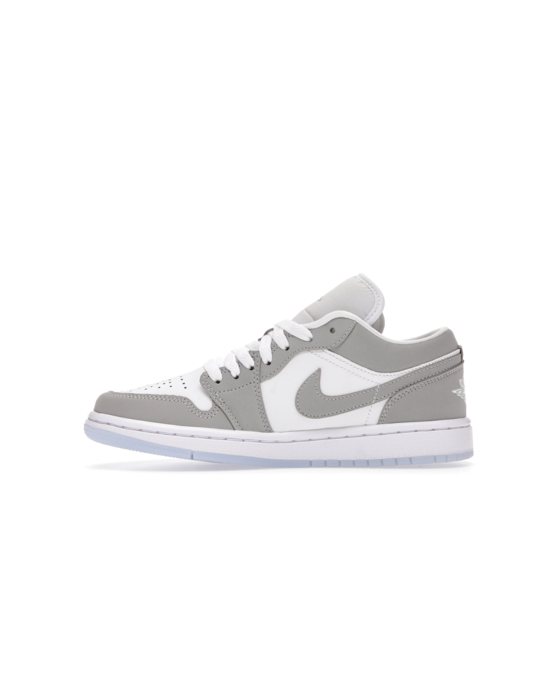 The Jordan 1 Low Wolf Grey features a white leather upper with Wolf Grey Durabuck overlays and Swooshes. From there, a Jordan Wings logo on the heel and a translucent outsole adds the finishing touch.