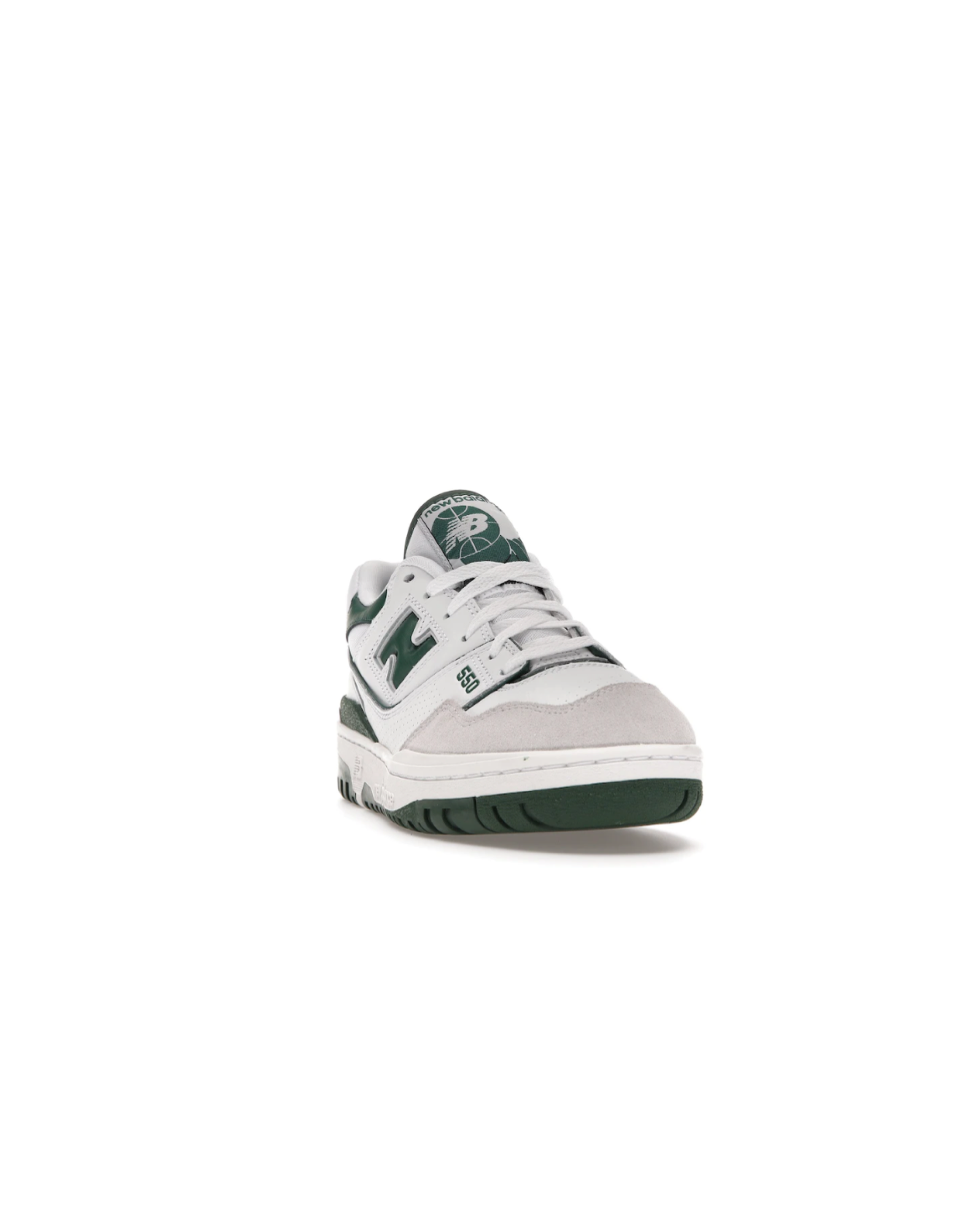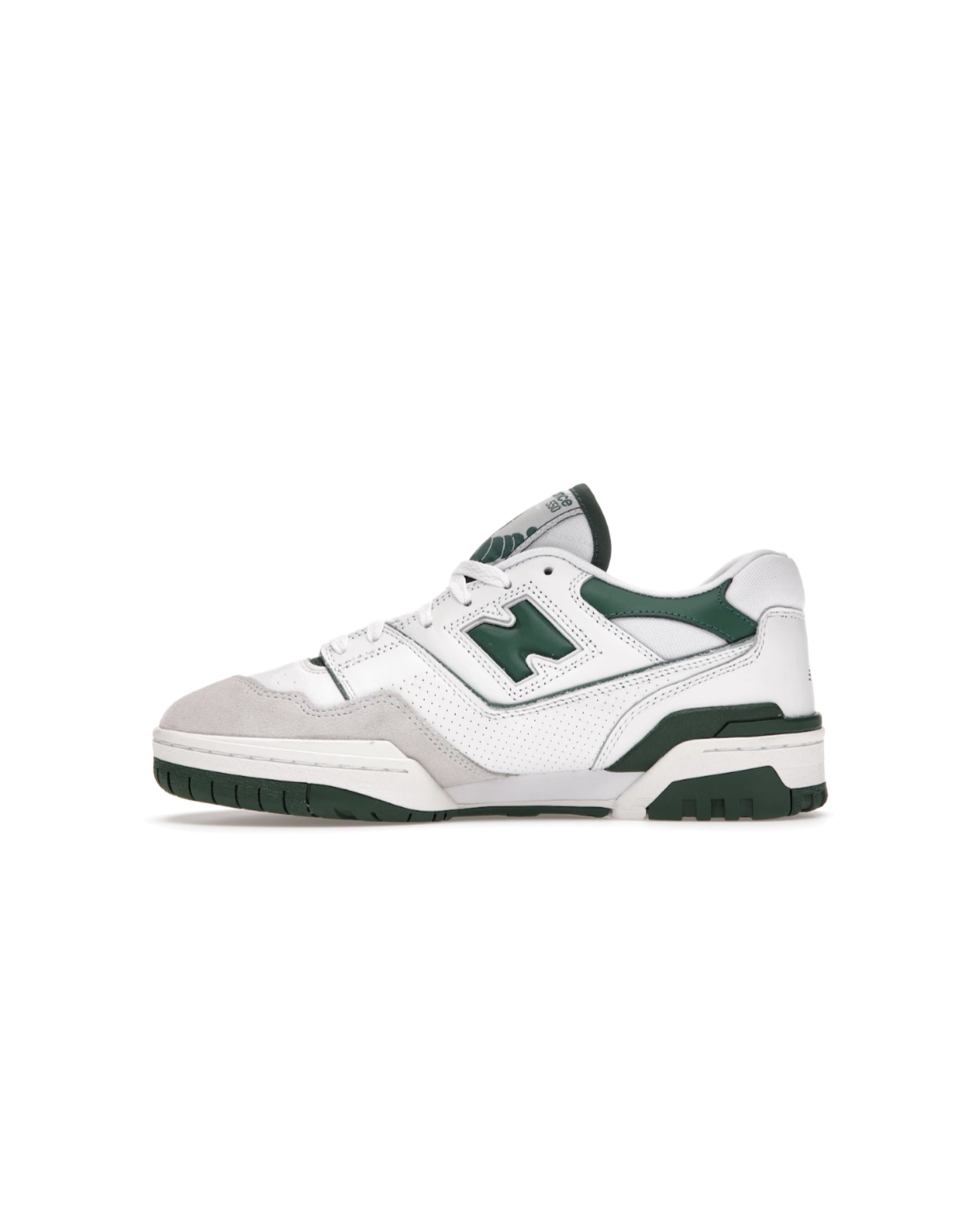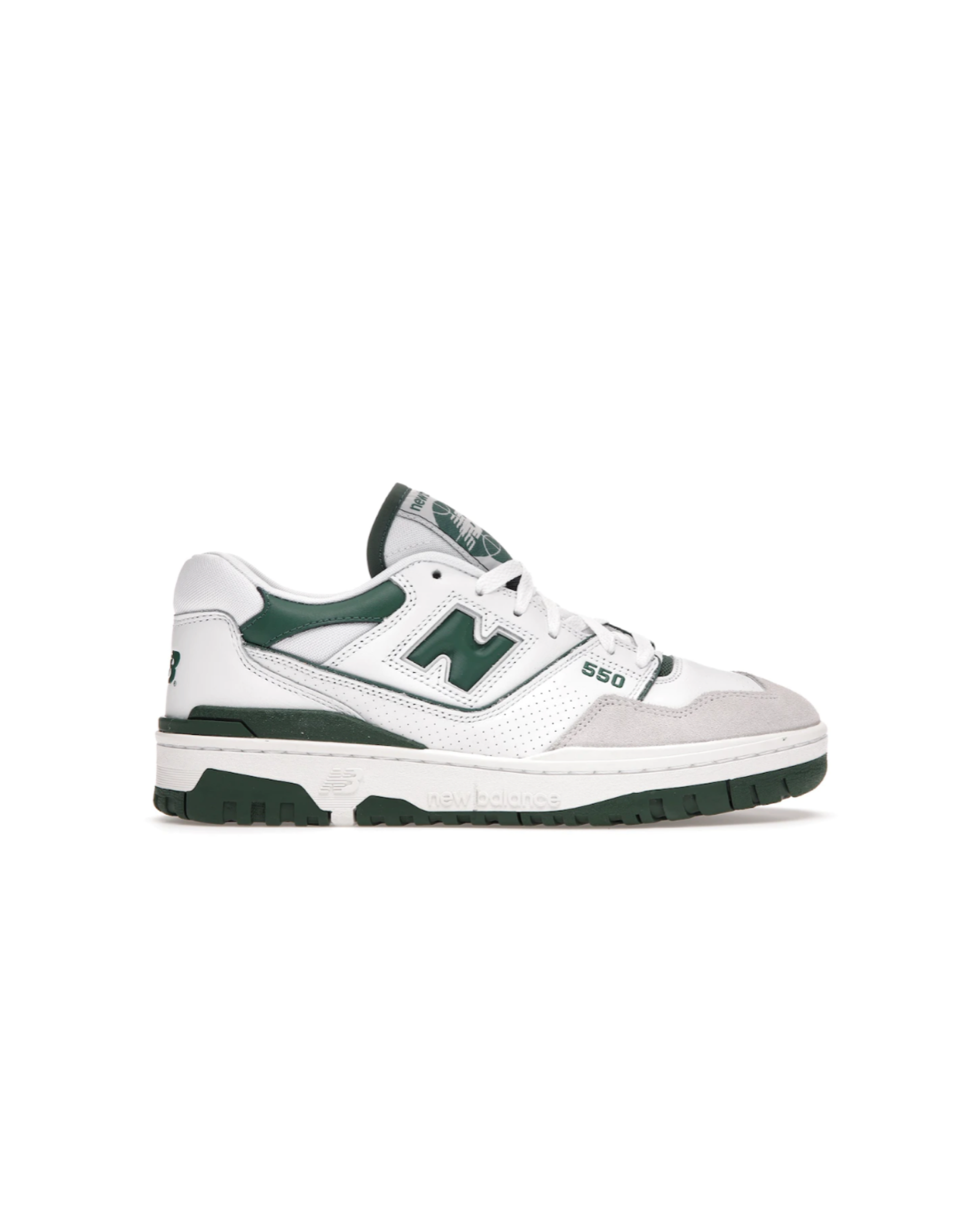The New Balance 550 White Green features a smooth white leather upper with a grey suede toe wrap and green detailing. From there, a New Balance Basketball woven tongue label and matching sole completes the design.